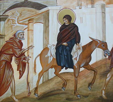 Maria sitzt seitlich auf einem ermatteten Esel. Vorneweg geht, es ist nur ein Bein erkennbar, sehr wahrscheinlich Jakob, ein Sohn Josephs aus erster Ehe. Joseph selbst, ein alter Mann, bildet das Schlusslicht dieser kleinen Reisegruppe.